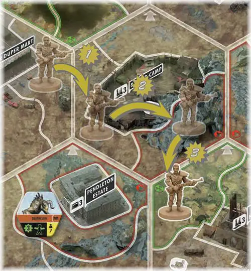 You use the move action to (you guessed it) move around the map! But be careful; the wasteland is hazardous, and there is rough terrain and plenty of radiation awaiting you.