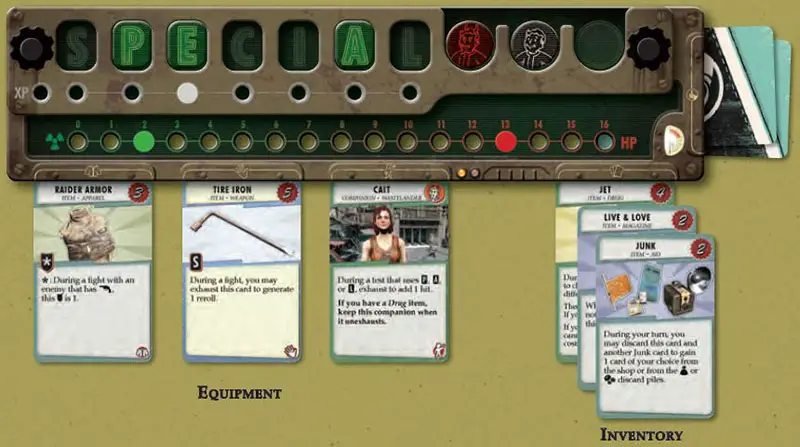 Additionally, you can have up to three cards equipped at time-one apparel, one weapon, and one companion, indicated by the slots on your player board. Equipped cards do not count toward your inventory.