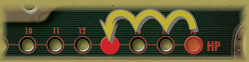 When you suffer damage, move the red peg on your player board a number of holes down the track equal to the amount of damage suffered.