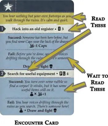 When resolving encounter cards, read them yourself. Read only the text that would normally be read aloud, and then make your decision before reading the text for your chosen outcome.