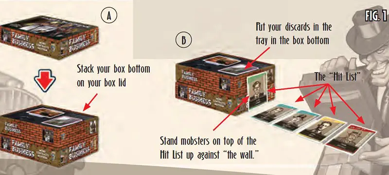 Place the box lid in the center of the table, so that all players can reach it. Put the box bottom on top of the lid, creating a stacked box. Use one of the short sides of the stacked box as "the wall". (See Fig. 1A). As you target mobsters for elimination, line them up against "the wall". (See 1B).