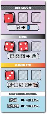 Each player has a player board with three basic actions available: Research, Mine, and Generate. To use one of these basic actions, place a worker in an available slot on your board and immediately execute that action, as described below.