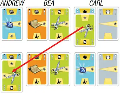 Andrew tries to draw his first card from Bea, but she plays "Elemental Shield" and cancels this effect. Andrew then draws his second card from Carl.