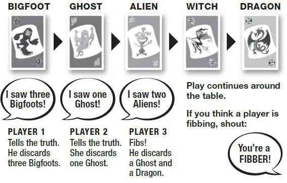 If you don't have Bigfoot cards, or you want to get rid of other cards, you can discard any cards from your hand and tell a fib. (For example, you could play three Alien cards but announce, "I saw three Bigfoots").