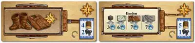 Take a Home Board each and place it (on your side of the table) below the Supply Board. Place the depicted components on the Home Board as indicated on it (also shown in the illustration on the right), i.e. certain tiles, 1 Horse, 4 Peat Tokens and 6 Goods Indicators.