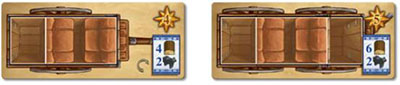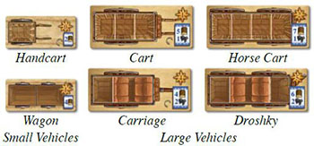 During the course of the game, you can build one or more Vehicles. There are 4 Parking Spaces in your Barn designated for Small Vehicles and other pieces of Equipment (like Plows and Peat Boats), and 3 spaces for Large Vehicles.