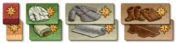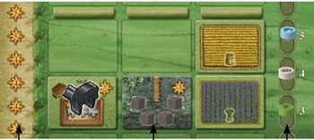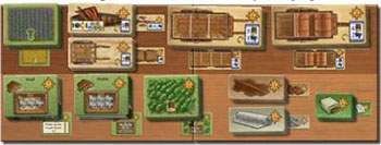 There are Fields (*), Plows and Peat Boats, Vehicles, Clothing*, Stalls and Depots, Stables and Double Stalls, as well as Forests and Parks. (If your gaming table is not big enough to accommodate all the components, you do not need to use the Supply Board at all: instead, place the stacks of tiles wherever you can).