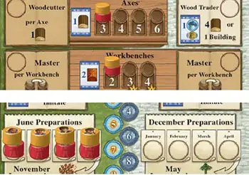 The Work Phase ends after all of the 8 Workers were used and both players declared the end of the Work Phase. In November (at the end of a Summer/Fall Half Year) and in May (at the end of a Winter/Spring Half Year), the players take stock of their belongings.