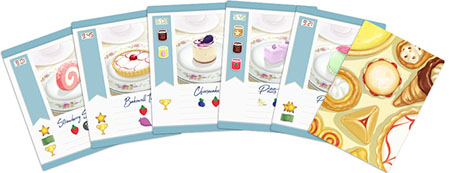 Choose one of the six chef personality cards to play against (on the reverse of each reference card) and shuffle the matching three chef cards to form their deck. Place this chef deck face down above the recipe book.