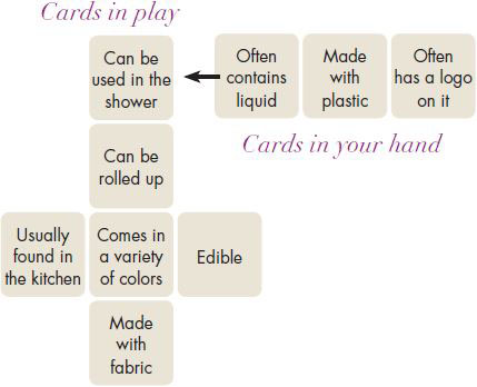 On your turn, look at the cards in your hand, as well as at the card(s) already in play. Then try to think of an object that fits the descriptions of as many cards as you hold, along with at least one card in play.