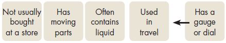 The above four cards were previously played with the word "airplane". You add the card "Has a gauge or dial" to the row and say "gas pump".