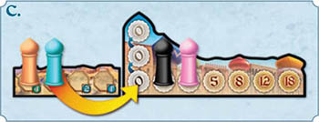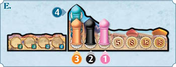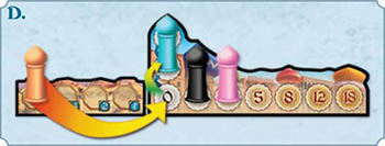Oliver wants to play early this turn, but he doesn't want to pay too much: he remembers Gold Coins are worth Victory Points at the end of the game. So he decides to go for spot marked "3", paying 3 gold to the bank and placing his Turn marker there.