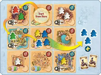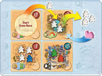 Note: During your moves, you can pass through Tiles that contain no Meeples, dropping 1 Meeple on each as you pass through, but you can NEVER end your move on an empty Tile, since there must always be at least 1 Meeple of the same color as your last Meeple already on that nal Tile!
