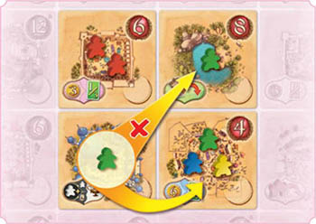 No Diagonal rule: All Meeples moves must be done sideways, from Tile to adjacent Tile, never in diagonal.