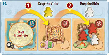 - 1 VP for each Vizier (YELLOW Meeple) you own + 10 VPS for each opponent who has strictly less Viziers than you do
