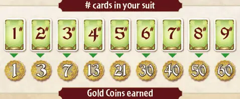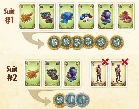 Note: Only sell when you are desperately short on Gold Coins to bet on your turn order. Otherwise you are usually better o keeping Merchandise to try and sell a larger suit later on. Even if you don't succeed in accumulating more Merchandise cards of other types, you will be able to at least sell your suit(s) at the same price on your last turn!