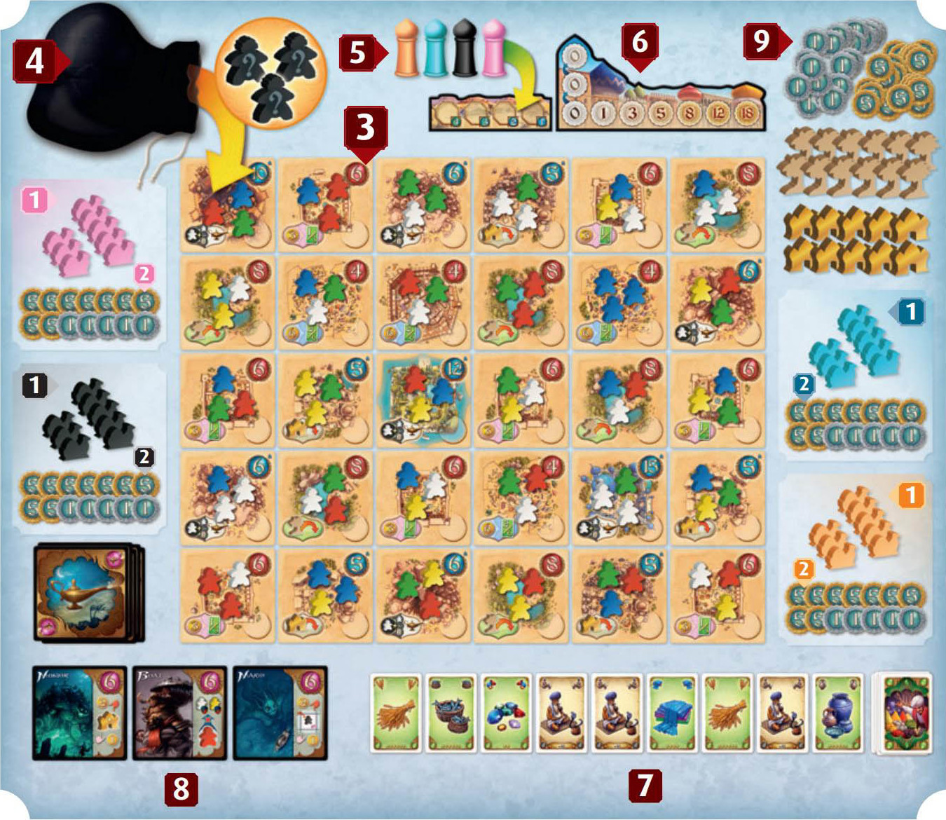 Mix all 30 Tiles and place them randomly face up, to form a rectangle of 5 x6 Tiles: This is the Sultanate 3.
