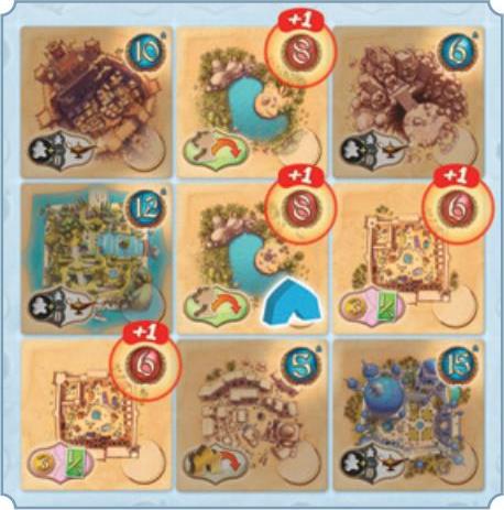 At the end of the game, your Tent scores the VPS on this tile + 1 VP per each surrounding Red valued tile, including the Tile where it stands, if it is also Red valued.