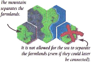 A player may never place a title such that it creates a separate landmass (even for a short time). This would occur if the sea separates two landmasses. There is no limit to the number of distinct farmland and mountain areas.