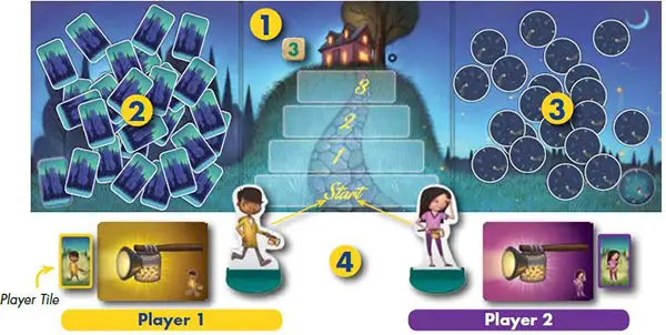 Each player selects a Player tile along with matching pawn and Flashlight card. (Place any unused sets back in the box). Put your pawn in a stand and then place it on the "Start" space on the board. Place your Player tile and Flashlight card face up in front of you.