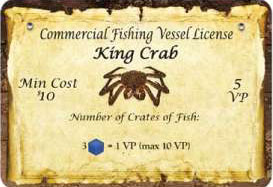 There are three unique King Crab license cards in the game, which grant game end VP bonuses. Additionally, all King Crab boats may be launched against any King Crab license.