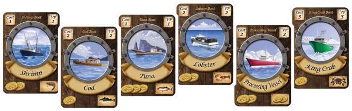 The 96 boat cards include 20 of each Shrimp, Lobster, and Processing Vessel and 12 of each Cod, Tuna, and King Crab. Their VP, Launch Cost, and cash value are as follows: