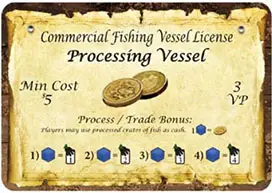 One (1) Processing Vessel license owned: May process one (1) crate of fish from each boat and may trade one (1) fish crate from Processing Vessel license for one (1) card from boat card supply during Processing and Trading phase.