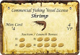 Each Shrimp license grants the player who owns it a discount on all transactions. Transactions include launching boats from your hand and purchasing licenses during the auction phase.