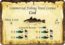 Depending on the amount of Cod licenses owned, the player may receive a bonus in the form of a card draw and the ability to launch two boats in the Launch Boats and Hire Captains phase.