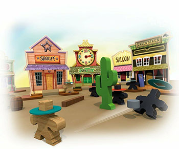 Upon successfully entering a building, the player places the cowboy on one of the building's two support blocks.