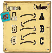 The game is played in successive rounds. Each round corresponds to one hour on the Town Hall's clock. A round is over once all cowboys from each team have played.