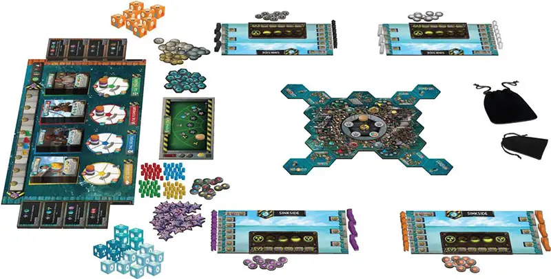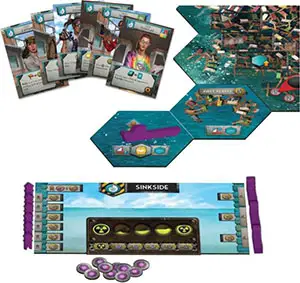 Take the Dock and Survivor Track tiles appropriate to your player count, and place them above and on the Hub Board respectively. Return unused Dock and Survivor Track tiles to the box.