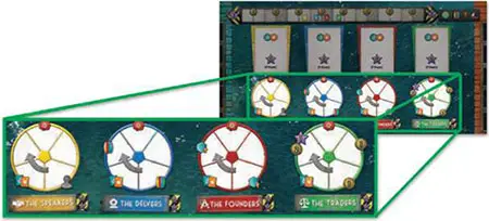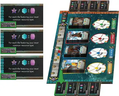 value on the bottom of that stack.Select (or randomly choose) one of those sets of tiles per player, and place these sets along the spaces on the left side of the Guild board, with their Sinkside (teal) faces up.