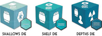 - One die for each of your Skiffs that is currently on an undepleted tile. The type of die you take for each Skiff is determined by the depth indicated on that Skiff's tile.