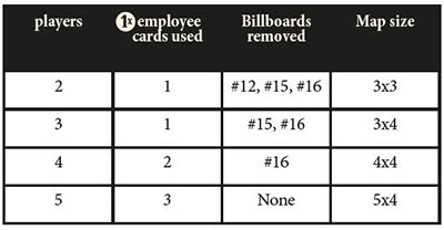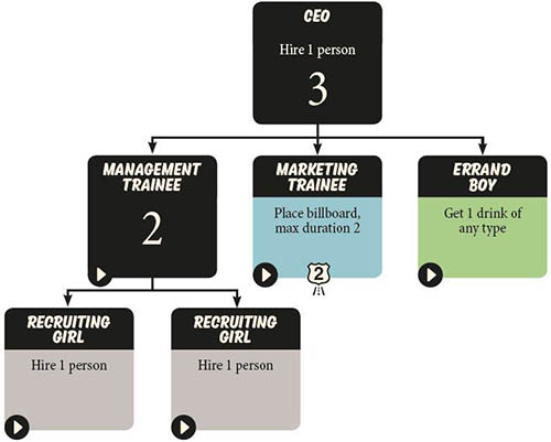 In all subsequent turns, after opening the pile, the cards at work must be placed into a company structure. The cards are placed in a pyramid. Each card is placed under the person he/she is reporting to. The top of the pyramid is the CEO, who obviously reports to nobody.