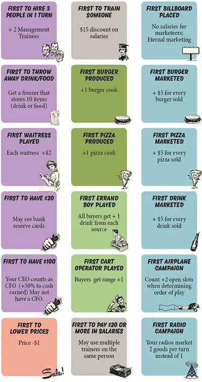 Each player chooses one of the restaurant chains available and receives a CEO card, 3 restaurants and a set of 3 bank reserve cards.