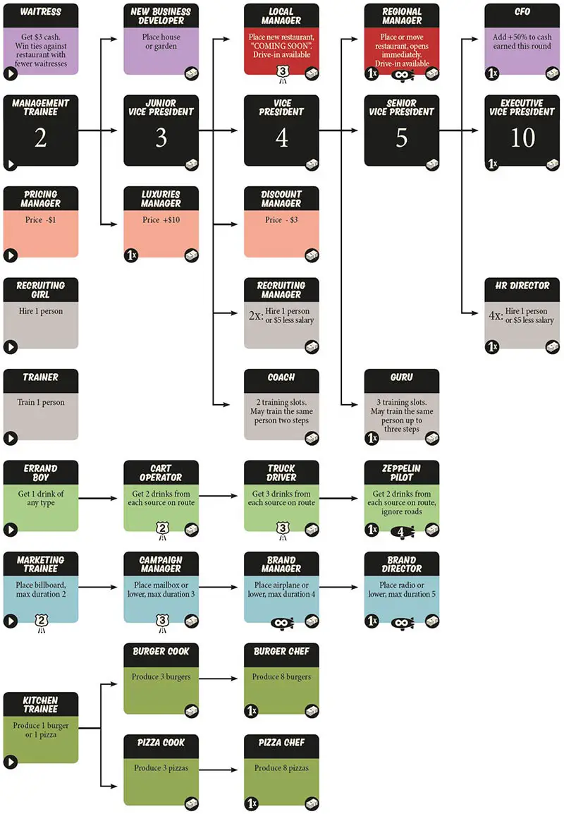 Marketeers, kitchen staff and buyers each have their own up- grade track. All other (non-entry) employees are trained directly from managers (black cards).