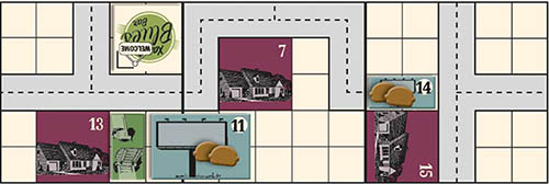Mailbox campaign: A mailbox reaches all houses it can get to without crossing a road (you can think of the area enclosed by roads and per- haps the border of the board as a "block"). A mailbox is only stopped by roads, and will freely pass through other map elements such as restaurants and houses. Place a demand token of the type advertised by the campaign on each house in the block.