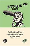 Zeppelin pilot: Starting from your restaurant entrance, trace a route of range 4, ignoring roads. Including the tile of your restaurant, the route will cover up to five tiles. You may not cover the same tile twice. Collect 2 drinks from stock for each drink symbol on the tiles you fly over. If there are multiple drink symbols on a tile, you may collect drinks for all of them.