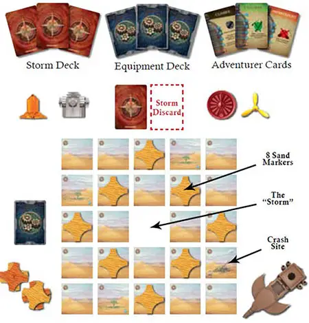 Separate the cards into the Storm deck (red back), Equipment deck (gear back), and Adventurer cards. Shuffle the Storm deck and place it face down, just above the top of the desert, with the compass symbol pointing away from the board to indicate "North", as shown below.