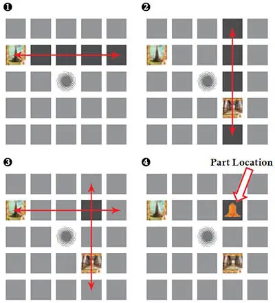 If both clues point to the Storm's location, place the part in the empty space. The next tile that moves into that position during the Sand Storm portion of the turn becomes the location where that part is found.