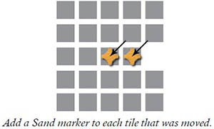 4adds 1 Sand marker onto each tile that he moved. Note that because there are now two Sand markers on those tiles they are blocked to movement.