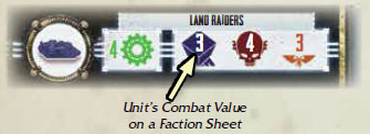 A. Roll Dice: Both the attacker and defender simultaneously roll a number of dice equal to the combined combat value of each of his unrouted units in the combat, as displayed on his faction sheet. For example, if the Ultramarines player has two Land Raiders in the combat, he rolls six dice.