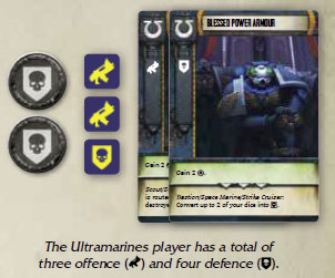 ) from dice, combat tokens, and faceup combat cards.Each defence icon (