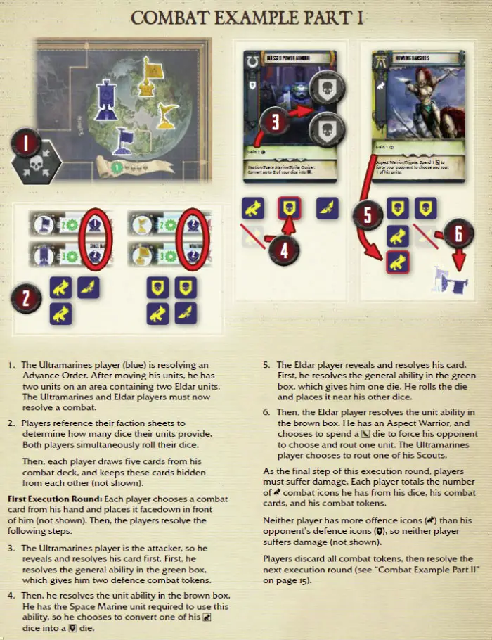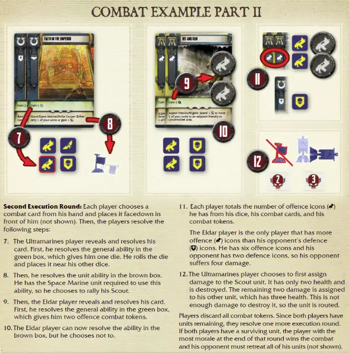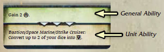 All combat cards have one or two combat ability boxes. When resolving a combat card, the player first resolves all general abilities (green box), then resolves all unit abilities (brown box). He resolves each ability in the order in which it is listed, from top to bottom.
