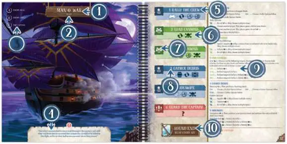 1Location Name2Location Type3Location Features (will have associated location dials)4Location Warning5Action Name6Action Guide Symbols7Action Type8Action Resolution Order9Action Effect10End of Round Section