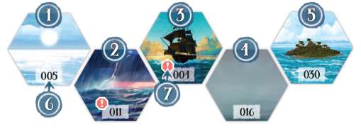 1Sun: Clear seas likely.2Storm: Rough seas likely3Ship: Another ship likely.4Fog: Mystery likely.5Island: Land likely.6Entry Number7Stop Symbol