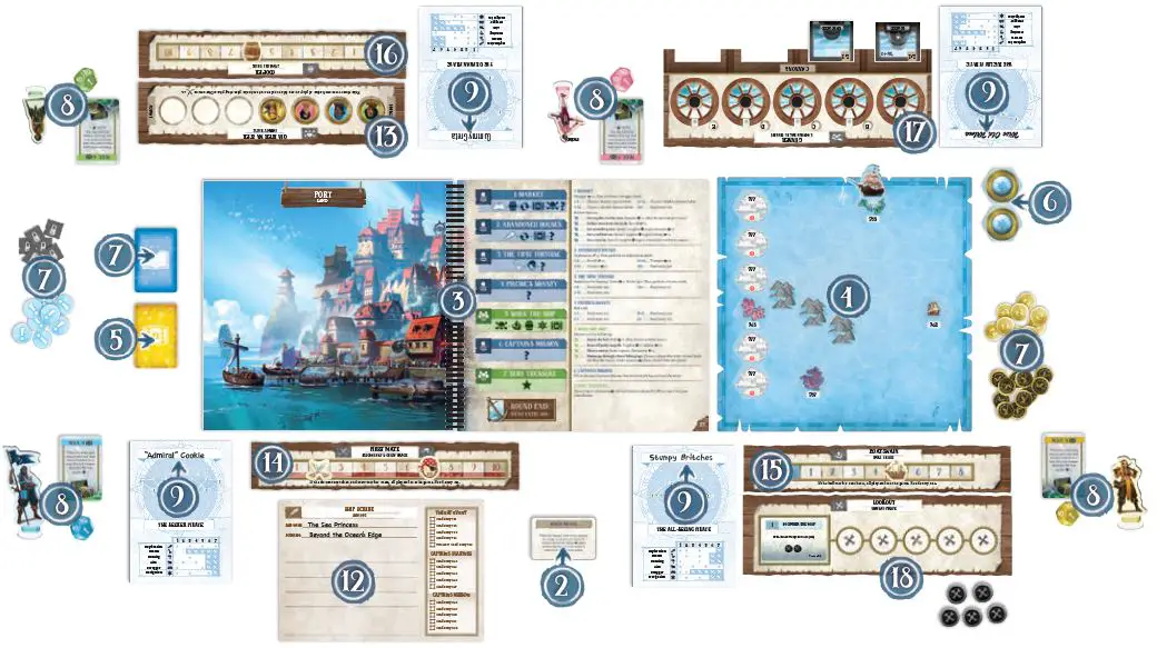 Collect the First Mate board and place the crew and discontent markers on the values indicated in the scenario setup.