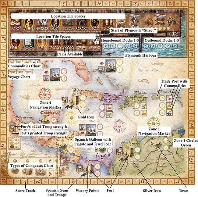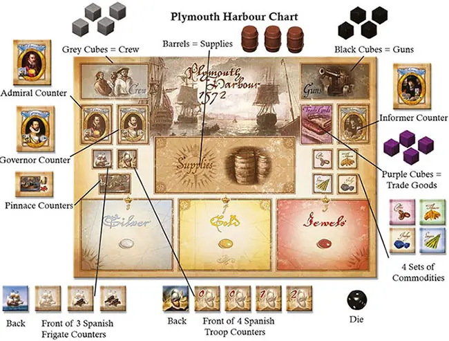 Place the Plymouth Harbor Chart next to the board and place the following on their respective icons: Gold, Silver, Jewels, 3 Spanish Frigates, 4 Troops, the Admiral, the Governor, the Informer, 2 Pinnaces, Cubes (grey, black, purple), Barrels and the Commodities (Sugar, Tobacco, Coffee, Indigo).