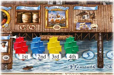 Place the players' Frigates in a cup and randomly draw out one at a time. Place the Frigates in the order drawn in Homebound Docks 1, then 2, then 3 etc. This determines the order in which the players will place their Discs and select items as they move along "Plymouth Street".